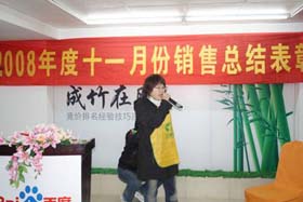 寒流襲擊,天氣驟冷,凍結(jié)不了我們熾熱的冠軍夢。2008年12月6日上午,我司11月銷售總結(jié)大會在公司7樓會議室開展得如火如荼。此次會議實現(xiàn)了從純娛樂向分享經(jīng)驗?zāi)J降霓D(zhuǎn)變,除了常規(guī)的歌曲表演、小品表演、“金典故事”講述外,我們更偏重于大家銷售經(jīng)驗、工作心得及個人見解的分享。一個人就是一個哈姆雷特,我們的銷售精英們個個經(jīng)驗豐富,演講起來一點也不遜于王安之等高級培訓(xùn)講師,相比之下更具有實用價值,更貼近我們的生活。